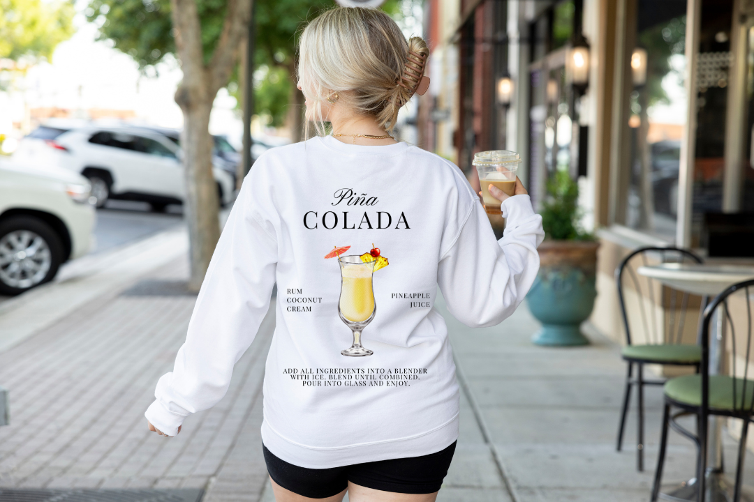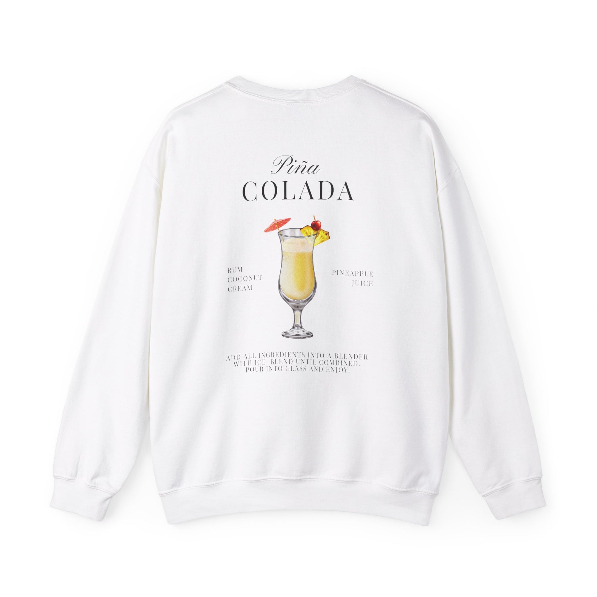 Pina Colada crewneck sweatshirt. Ideal for any situation, this unisex heavy blend crewneck sweatshirt is pure comfort. These garments are made from polyester and cotton. This combination helps designs come out looking fresh and beautiful. The collar is ribbed knit, so it retains its shape even after washing. No itchy side seams.